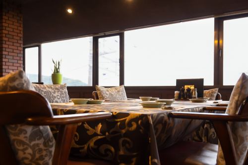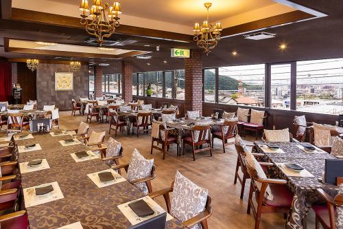 席と席の間隔が広く、椅子はゆったり。ゆっくり寛げると好評です。壁の煉瓦やふんだんに使われた木の温もりの中に重厚感のあるインテリア。そして窓一面から見える景色。上質な空間で心地よい時間が過ごせます。